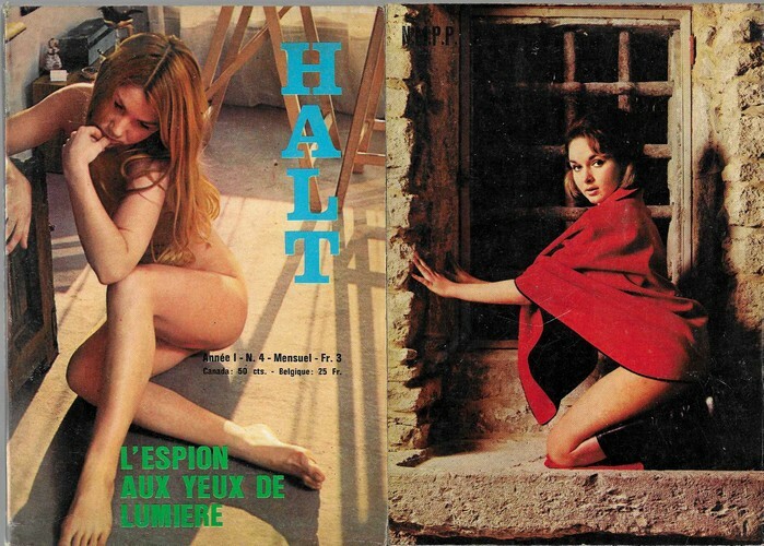 Editions Brandt / Collection " Halt ", mensuel n° 4 de 1969. In-12 broché de 194 pages au format 17 x 12 cm. Couvertures photographiques. Dos carré avec infimes frottis. Plats et intérieur frais. Contient des dossiers avec photo érotiques, une nouvelle policière par John Beoland " Le bon samaritain " et un long roman-photo policier teinté d'érotisme " L'Espion aux yeux de lumière ". Rare édition originale surtout dans un tel état de fraicheur.