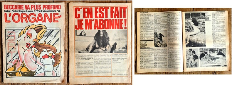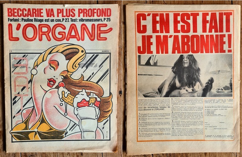 L’Organe. Le premier journal Raide et le meilleur. Numéro 1 de 1975. In-4 agrafé de 32 pages au format 37,5 x 28,5 cm. Magnifique couverture illustrée par Mick Haggerty. Plats avec petits frottis, minuscules traces de plis aux coins et petite déchirure en haut de la couverture. Intérieur resté frais. Numéro consacré l'érotisme et la pornographie au cinéma et à la BD ( Histoire d'O ), avec longs articles, accompagnés de photos en noir et en couleur, consacrés à Claudine Beccarie, au porno rétro, au 1er festival de film porno, avec textes de André Bercoff, Michel Caen, Claudine Beccarie, Sylvia Bourdon, Pierre Bourgeade, Jean-Pierre Bouyxou, Lydie Brown, Gerry Damiano, Rémo Forlani, Gotlib, Al Goldstein, Isaure, François Jouffa, Stanley Lubrick, Sylvie Meyer, Jean-Louis Vilier, Micehl Verpillat, Gérard Wolf. Bien complet du poster central avec dessin. Très rare édition originale en bel état général.
