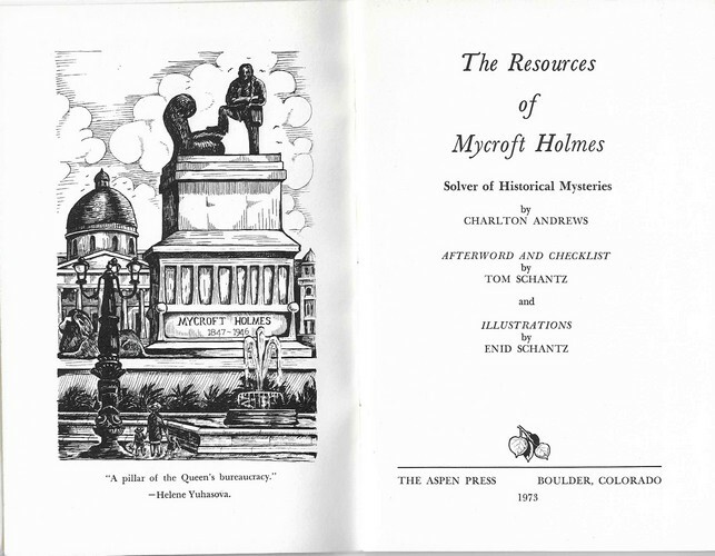 Etats-Unis, The Aspen Press, 1973. In-8 agrafé de 40 pages au format 20,5 x 13 cm. Couvertures illustrées. Magnifique frontispice illustré par Enid Schantz. Plats et intérieur frais. Ouvrage contenant trois nouvelles mettant en scène Mycroft Holmes, qui en tant que détective, résout notamment le mystère de L’homme au Masque de Fer et de qui fut vraiment " William Shakespeare "....Couvertures et illustration de Enid Schantz. Postface de Tom Schantz pour ces textes écrit à l’origine en 1903. Tirage unique et limité à 500 exemplaires avec prière d'insérer sous forme de marque-page. Rare édition originale américaine en superbe état général de fraicheur.
