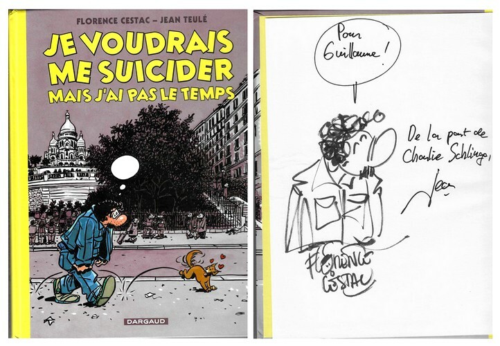 Editions Dargaud 2009. In-4 cartonnage éditeur de 98 pages au format 30 x 22,5 cm. Couverture illustrée. Photographie de Charlie Schlingo au 4ème plat. Dos rond avec petit tassement en haut et en bas. Plats et intérieur frais. Dessins en noir de Florence Cestac sur scénario de Jean Teulé, pour cette BD en hommage à Charlie Schlingo. Très bel état de fraicheur. Edition originale, notée " Première édition ". Précieux exemplaire ornée d'un superbe dessin original, pleine page, signé, de Florence Cestac et d'une cordiale dédicace de Jean Teulé.