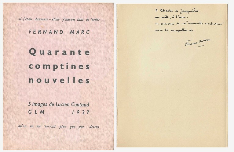 GLM 1937. In-12 broché de 42 pages au format 17 x 13 cm. Couverture avec titre imprimé. Dos carré muet. Plats et intérieur frais. Textes accompagnés de 5 superbes dessins en noir de Lucien Coutaud. Un des 430 exemplaires, numérotés, sur Alfa crème ( n° 79 ). Edition originale en superbe état général. Précieux exemplaire, enrichi d'une cordiale et belle dédicace de Fernand Marc à l'éditeur Charles de Jonquières. Provenance idéale.