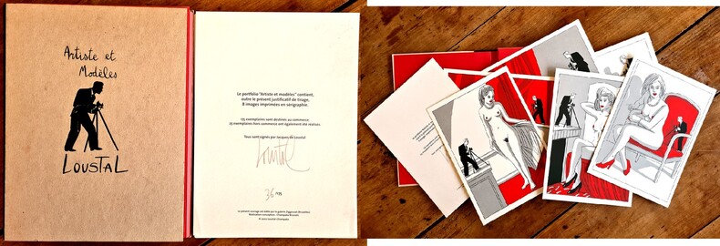 8 Bruxelles, Galerie Ziggourat 2002. In-8 en feuilles sous chemise illustrée au format 24,5 x 20 cm. Couverture illustrée. Plats et intérieur frais. Contient 8 planches illustrées et imprimées en sérigraphie + le justificatif de tirage, numéroté et signé par Jacques de Loustal dit Loustal. Ces œuvres furent exposées à la galerie Ziggourat à Bruxelles en Belgique. Tirage unique à 200 exemplaires numérotés et signés par Loustal ( n° 36 ). Edition originale en superbe état général.