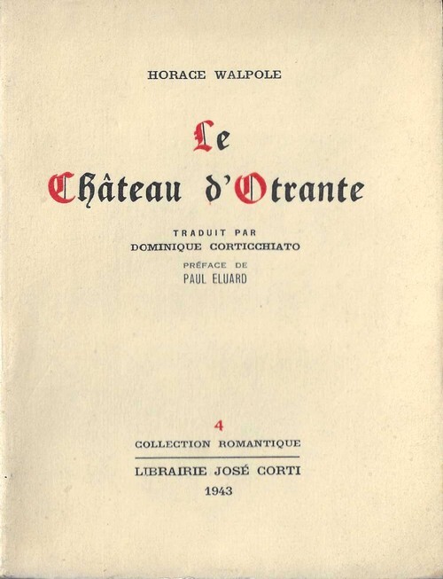 José Corti / Collection Romantique n° 4 de 1943. In-12 broché de 154 pages au format 16,5 x 12,5 cm. Belle couverture typographique, imprimée en deux tons ( noir et rouge ). Dos carré. Plats et intérieur frais. Exemplaire non coupé. Nouvelle traduction de Dominique Corticchiato. Belle préface inédite de Paul Eluard. En fin d'ouvrage on trouve les préfaces de la première et de la deuxième édition. Peu courant. Edition originale.