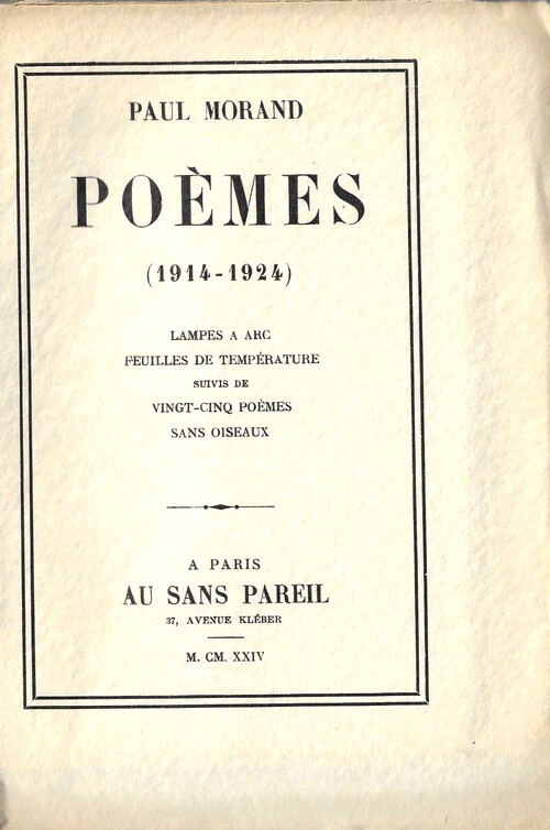 A Paris, Au Sans Pareil 1924. In-8 broché à marges de 136 pages au format 20,5 x 14 cm. Couverture avec titre imprimé. Dos carré. Plats et intérieur frais. Cet ouvrage contient les deux premiers recueils de poèmes de Paul Morand : Lampes à arc et Feuilles de température, qui étaient épuisés. Ils sont enrichis de " Vingt-cinq poèmes sans oiseaux " qui paraissent ici pour la première fois. Edition collective en partie originale, en superbe état général de fraicheur. Rare aussi frais.