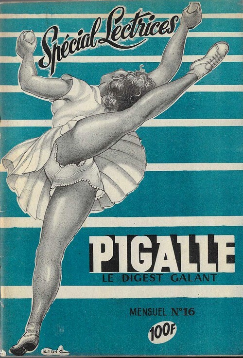 Editions du Trapèze, Lyon / Revue Pigalle, le Digest Galant. Spécial Lectrices n° 16 d'octobre 1950. In-12 agrafé de 64 pages au format 20 x 14 cm. Superbe couverture illustrée par Jacques Granges. Plats et intérieur frais, malgré un petit frottis au 4ème plat. Ce numéro, qui est le dernier de cette revue, contient un récit de F. Antonio, pseudonyme reconnu de Frédéric Dard intitulé " Les Lurons de Vatefaire ", illustrée par Roger Sam. Nombreuses autres participations avec dessins et photographies " coquines " en noir in et hors texte. Rare édition originale en superbe état général.