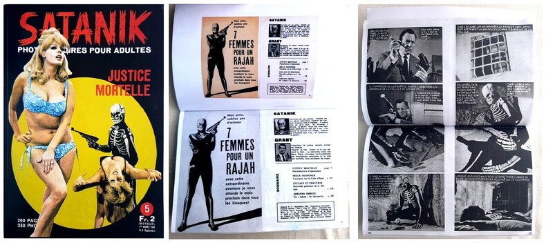 Sans mention d'éditeur, ni de date ( Ponzoni Editeur 1966 ). Tirage pirate collector édité à petit nombre d'exemplaires en facsimilé grand format du n° 1 de la série " Satanik " qui fut publié par les éditions Ponzoni en 1966. In-8 broché de 190 pages au format 29 x 20,5 cm. Couvertures illustrées. Dos carré avec titre. Plats et intérieur frais. Les pages sont imprimées à l'horizontale. Rare édition en état de neuf. Cet ouvrage qui fait partie de ma collection personnelle, fut trouvé sur une brocante dans un petit lot de facsimilés, certainement réalisés par un amateur. Il porte une étiquette " Collection privée ". Curiosité bibliophilique.