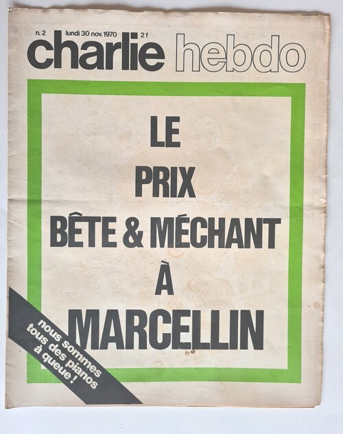 Charlie-Hebdo n° 2 du lundi 30 novembre 1970. In-4 en feuilles de 16 pages au format 36,5 x 29 cm. Couverture avec titre imprimé. 4ème plat illustré. Petites brunissures sur les plats. Intérieur frais. Textes et dessins en noir de Wolinski, Reiser, Cavanna, Cabu, Willem, Gébé, etc. Prix " Bête et Méchant " décerné à Raymond Marcellin, Ministre de l'intérieur de 1968 à 1974, qui fut l'incarnation du retour à l'ordre musclé après les événements de mai 1968. Rare édition originale en bel état général. Les petits défauts sont accentués par l'appareil photo.
