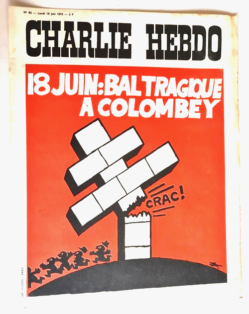 Rare affichette publicitaire pour kiosque Charlie-Hebdo n° 83 du lundi 19 juin 1972 : Bal tragique à Colombey. Format 38 x 29 cm. Couverture illustrée en offset. Minuscules brunissures au bord droit. L'image et les contraste sont malheureusement accentués par l'appareil photo, car l'exemplaire est dans un magnifique état de fraicheur, très blanc et très propre et non plié. Rarissime édition originale.