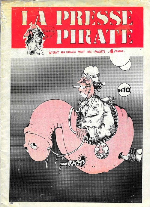Editions Presse Pirate / Fanzine La Presse Pirate n° 10 de 1975. In-4 agrafé de 28 pages au format 30 x 22 cm. Couvertures illustrées par Hube. Déchirure et mors supérieur fendu. Plats avec petites brunissures. Intérieur resté frais. Fanzine en petit tirage avec textes et dessins inédits en noir de Hube, Serge Clerc, Jean-Louis Tripier, Kmiecik, etc. Rare édition originale, en état général correct.