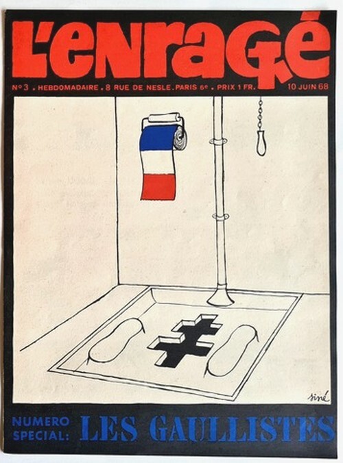 Jean-Jacques Pauvert / Revue L'Enragé n° 3, numéro spécial " Les Gaullistes " de 1968. In-4 en feuilles de 8 pages au format 31 x 23 cm. Couvertures illustrées. Plats et intérieur parfait. Textes et dessins de Siné, Roland Topor, Cardon, Flip, Cabu, Wolinski, Malsen, etc. Edition originale en superbe état général, proche du neuf.L'Enragé est un journal satirique et une emblématique revue contestataire et anti (gaulliste, colonialiste, conformiste, religieux...),d’inspiration anarchiste, fondé au début de mai 1968 par Maurice Sinet dit Siné et édité par Jean-Jacques Pauvert. Il ne connut que 12 numéros et 9 procès !. Dans ses pages on trouvait des auteurs venus d'autres journaux s'inspirant de cet esprit contestataire et libertaire, dont Siné, Reiser, Cabu, Topor, Wolinski, Willem, Soulas. Tous avaient fait partie de magazines comme Hara-Kiri, Hara-Kiri Hebdo qui deviendra plus tard Charlie Hebdo. L'enragé connut un grand succès pendant et juste après les évènements de Mai 68.