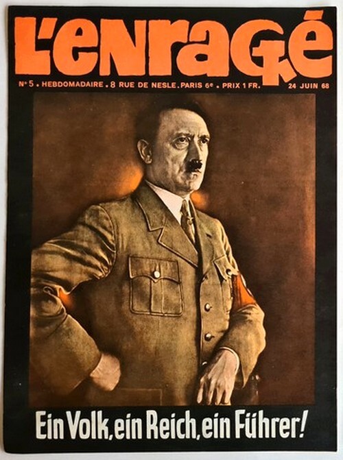 Jean-Jacques Pauvert / Revue L'Enragé n° 5 de 1968. In-4 en feuilles de 8 pages au format 31 x 23 cm. Couvertures illustrées. Plats et intérieur parfait. Numéro en allemand consacré à l'analyse de l'affiche de propagande nazie : " Ein Volk, ein Reich, ein Führer " ainsi qu'à de nombreux autres dessins de propagande hitlérienne. La couverture est une reproduction de l'affiche réalisée par Heinrich Knirr en 1935-1936. Il manque le feuillet avec la traduction en français. Edition originale en superbe état général, proche du neuf.L'Enragé est un journal satirique et une emblématique revue contestataire et anti (gaulliste, colonialiste, conformiste, religieux...),d’inspiration anarchiste, fondé au début de mai 1968 par Maurice Sinet dit Siné et édité par Jean-Jacques Pauvert. Il ne connut que 12 numéros et 9 procès !. Dans ses pages on trouvait des auteurs venus d'autres journaux s'inspirant de cet esprit contestataire et libertaire, dont Siné, Reiser, Cabu, Topor, Wolinski, Willem, Soulas. Tous avaient fait partie de magazines comme Hara-Kiri, Hara-Kiri Hebdo qui deviendra plus tard Charlie Hebdo. L'enragé connut un grand succès pendant et juste après les évènements de Mai 68.
