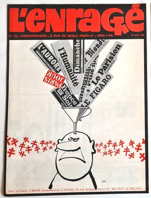 Jean-Jacques Pauvert / Revue L'Enragé n° 10 de 1968. In-4 en feuilles de 8 pages au format 31 x 23 cm. Couvertures illustrées. Plats et intérieur parfait. Textes et dessins de Siné, Willem, R.Cobb, Sésamo, Malsen, Flip, Wolinski, etc. Edition originale en superbe état général, proche du neuf.L'Enragé est un journal satirique et une emblématique revue contestataire et anti (gaulliste, colonialiste, conformiste, religieux...),d’inspiration anarchiste, fondé au début de mai 1968 par Maurice Sinet dit Siné et édité par Jean-Jacques Pauvert. Il ne connut que 12 numéros et 9 procès !. Dans ses pages on trouvait des auteurs venus d'autres journaux s'inspirant de cet esprit contestataire et libertaire, dont Siné, Reiser, Cabu, Topor, Wolinski, Willem, Soulas. Tous avaient fait partie de magazines comme Hara-Kiri, Hara-Kiri Hebdo qui deviendra plus tard Charlie Hebdo. L'enragé connut un grand succès pendant et juste après les évènements de Mai 68.