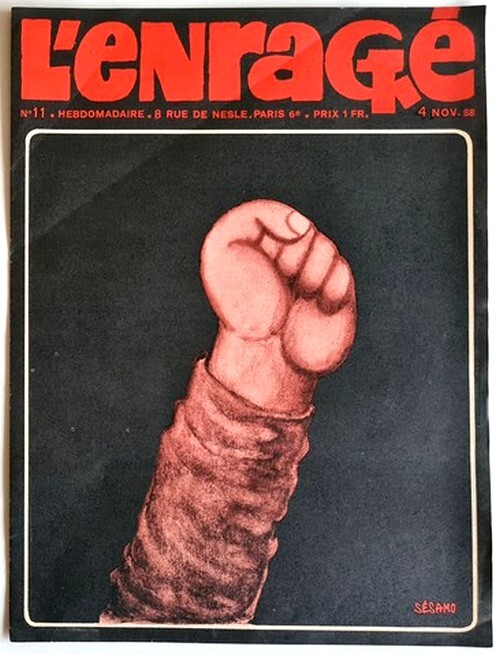 Jean-Jacques Pauvert / Revue L'Enragé n° 11 de 1968. In-4 en feuilles de 8 pages au format 31 x 23 cm. Couvertures illustrées. Plats et intérieur parfait. Textes et dessins de Siné, Willem, Sabadel, Soulas, Sésamo, Lacroix, Wolinski, etc. Edition originale en superbe état général, proche du neuf.L'Enragé est un journal satirique et une emblématique revue contestataire et anti (gaulliste, colonialiste, conformiste, religieux...),d’inspiration anarchiste, fondé au début de mai 1968 par Maurice Sinet dit Siné et édité par Jean-Jacques Pauvert. Il ne connut que 12 numéros et 9 procès !. Dans ses pages on trouvait des auteurs venus d'autres journaux s'inspirant de cet esprit contestataire et libertaire, dont Siné, Reiser, Cabu, Topor, Wolinski, Willem, Soulas. Tous avaient fait partie de magazines comme Hara-Kiri, Hara-Kiri Hebdo qui deviendra plus tard Charlie Hebdo. L'enragé connut un grand succès pendant et juste après les évènements de Mai 68.