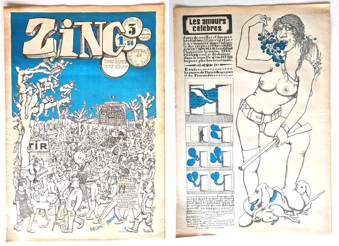 Editions Le Pop, Revue Zinc n° 3, Journal de bandes dessinées, très beau, pas cher, du quatrième trimestre 1971. In-4 en feuilles de 12 pages au format 42 x 29,5 cm. Couverture illustrée par Pierre Guitton qui est aussi directeur de publication. Bandes dessinées en noir par Pierre Guitton, Christiane Lefranc, T de Ter'Neuve, Nicoulaud, Soulas, etc. Le journal est non plié. Les " défauts " de l'image et les contrastes sont malheureusement accentués par l'appareil photo, car l'exemplaire est en très bel état général de fraicheur. Très rare édition originale.Pierre Guitton, avant de se consacrer exclusivement à la peinture à la fin des années 1980, dessine pour " Charlie Mensuel ", " Hara-Kiri" et " (À suivre) ", mais il est surtout réputé pour avoir fondé la revue " Zinc " qui fut l'un des fers de lance de la bande dessinée " Underground " française du début des années 1970.