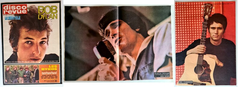 Disco-Revue, Le Lien Internationale des Rockers, n° 12 de décembre 1965. In-4 en feuilles de 16 pages au format 32 x 32 cm. Couverture avec photo de Bob Dylan. Plats et intérieur très frais. Exemplaire non plié. Magazine fondé par Jean-Claude Berthon. Numéro spécial sur Bob Dylan avec articles sur The Animals, The Who, Vincent Taylor, Chuck Berry, les échos du Rock, les parutions de disques, les concerts...Complet du poster de Vincent Taylor. Photographies en noir et en couleurs. Les " défauts " visibles sur les bords et les coins ainsi que les contrastes sont accentués par l'appareil photo, car en fait l'exemplaire est sans un superbe état général de fraicheur. Rare édition originale.