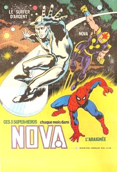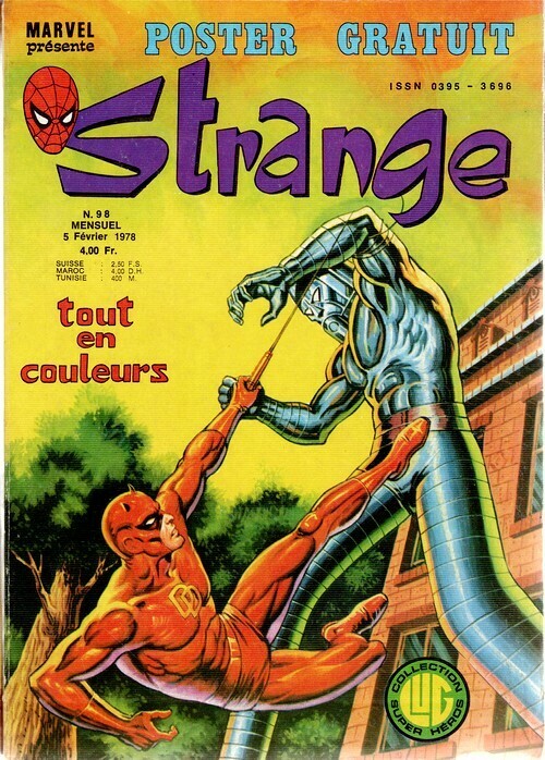 Editions Lug. Strange n° 98 du 5 janvier 1978. In-4 broché de 88 pages au format 24 x 17 cm. Belle couverture illustrée. Dos carré. Plats et intérieur frais malgré d'infimes frottis aux coins. Complet du Poster encarté. Le scan du poster est juste indicatif, celui étant solidaire, je n'ai pas pris le risque de le déplier. Contient les séries : Daredevil, Iron Man, l'Araignée ( Spider-Man ). Scénarios de Stan Lee, Chris Claremont, Bill Mantlo, avec dessins en couleurs par Syd Shorès, Georges Tuska et John Romita. Rare édition originale, en très bel état général de fraicheur.