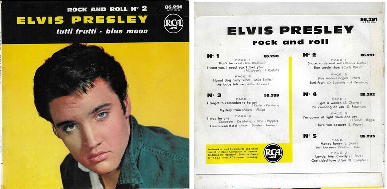 RCA – 86.291 / Série Rock and Roll n° 2. Réédition de 1961. Disque 45 tours avec belle pochette photographique. Contient les titres : Shake, Rattle And Roll - Blue Suede Shoes - Blue Moon - Tutti Frutti. Disque en superbe état, apparemment très peu écouté. Quatrième pressage français.