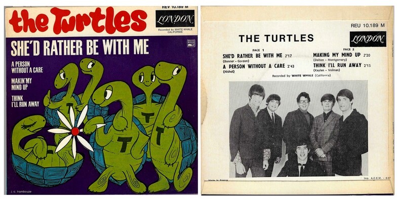 London Records – REU 10.189 de 1967. Disque 45 tours avec belle pochette illustrée par J. C. Trambouze. Photographie au 4ème plat. Contient les titres : She'd Rather Be With Me - A Person Without A Care - Making My Mind Up - Think I'll Run Away. Disque en superbe état, apparemment très peu écouté. 1er pressage français.