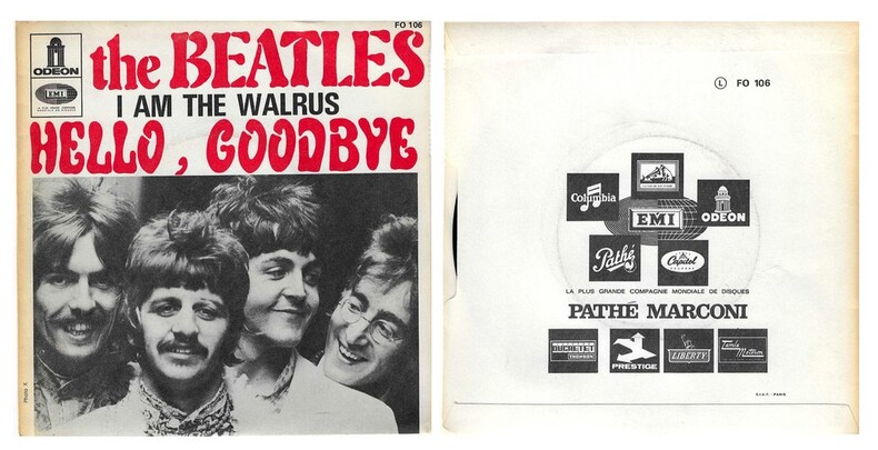 Odeon – FO 106 de 1967. Disque 45 tours avec belle pochette photographique des Beatles. Contient les titres : Hello, Goodbye - I Am the Walrus. Disque en superbe état, apparemment très peu écouté. Rare 1er pressage français.