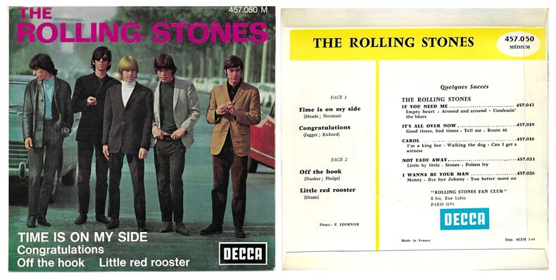 Decca – 457.050 M de 1965. Disque 45 tours avec pochette photographique. Disque qui contient les titres : Time Is On My Side - Congratulations - Off The Hook - Little Red Rooster. Disque en superbe état, apparemment très peu écouté. Deuxième pressage français de mars 1965.