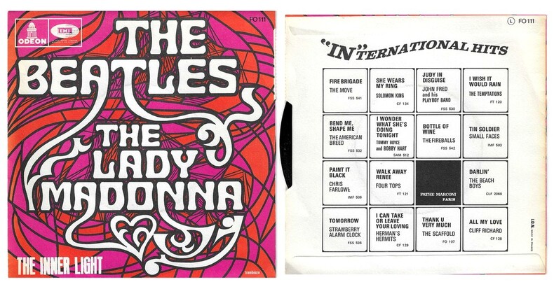Odeon – FO 111, Série "In"Ternational Hits de 1968. Disque 45 tours avec belle pochette illustrée par Trambouze. Contient les titres : Lady Madonna - The Inner Light. Disque en superbe état, apparemment très peu écouté. Rare 1er pressage français avec inscrit sur la couverture " The Lady Madonna ".