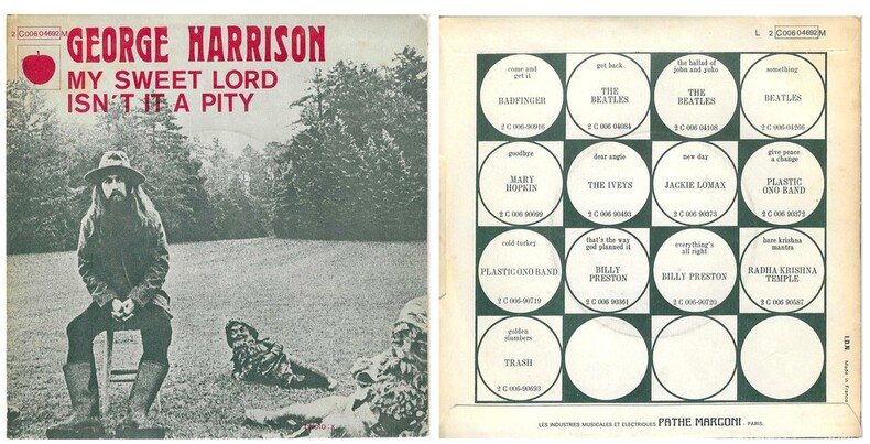Les Industries Musicales et Electriques Pathé Marconi / Apple Records – 2 C 006 04692 M de 1971. Disque 45 tours avec belle pochette photographique. Complet de la languette intérieure. Contient les titres :My Sweet Lord - Isn't It A Pity. Disque en superbe état, apparemment très peu écouté. Rare 1er pressage français.