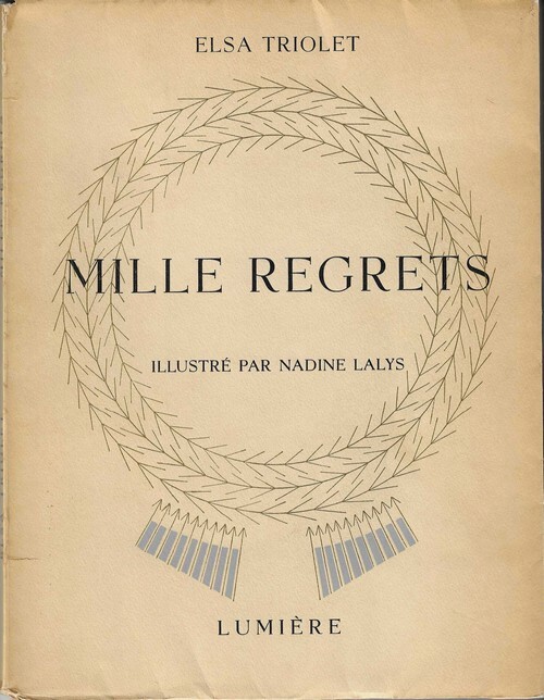 Bruxelles, Aux Dépens des Editions Lumière / Collection " La Flèche d'Or " n° 9 de 1944. In-4 broché de 73 pages au format 26,5 x 20,5 cm. Couverture illustrée, rempliée. Dos carré avec petite brunissure au bas. Plats avec de petits frottis et tassements aux coins, ainsi que quelques rares brunissures. Intérieur frais. Texte de Elsa Triolet avec 6 superbes dessins hors texte, en noir, en camaïeu, par Nadine Lalys. Un des 500 exemplaires, numérotés sur vélin pur fil ( n° 243 ). Edition originale illustrée de ce texte paru la première fois en 1942 chez Denoël. Bel état général.