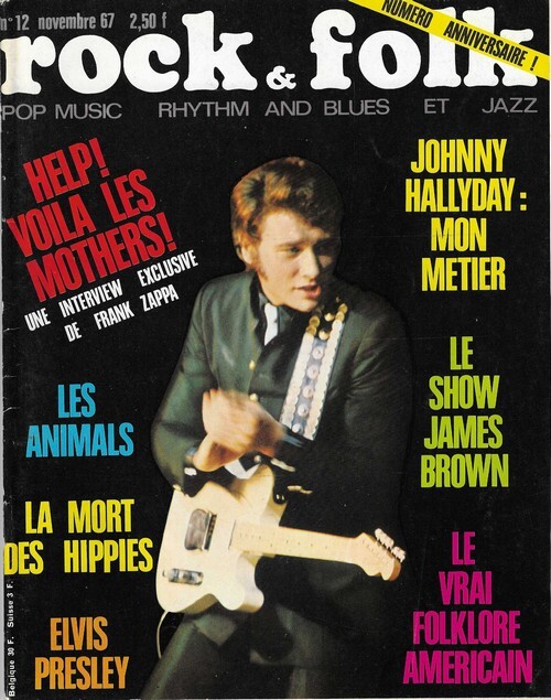 Revue Rock & Folk n° 12 de novembre 1967. In-4 agrafé de 70 pages, au format 27 x 21,5 cm. Couvertures photographiques avec Johnny Hallyday. Couvertures avec d'infimes frottis aux coins. Intérieur frais. Mensuel musical français consacré à la musique rock et pop, fondé en 1966 par Robert Baudelet, Jean Tronchot, Philippe Adler, Jean-Pierre Leloir et Philippe Koechlin. La revue connut la participation de nombreux photographes dont : Jean-Pierre Leloir, Claude Gassian, Pierre Terrasson, Gaëlle Ghesquière, Bruno Ducourant,Patrice Guino, Jean-Louis Rancurel, Dominique Tarlé, Bertrand Alary et Saddri Derradji. Nombreux articles sur le Rock, le blues, la soul, la pop dont : Frank Zappa, James Brown, Johnny Hallyday, Elvis Presley, The Animals, etc. Nombreuses chroniques avec de très nombreuses photographies en noir et blanc.. Rarissime édition originale, en très bel état de fraicheur de ce mythique n° 12 " Anniversaire ".