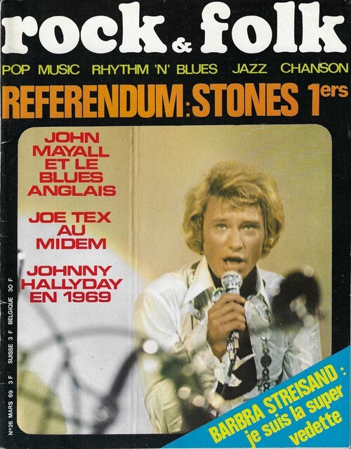 Revue Rock & Folk n° 26 de mars 1969. In-4 agrafé de 70 pages, au format 27 x 21,5 cm. Couvertures photographiques avec Johnny Hallyday. Couvertures avec d'infimes frottis aux coins. Intérieur frais. Mensuel musical français consacré à la musique rock et pop, fondé en 1966 par Robert Baudelet, Jean Tronchot, Philippe Adler, Jean-Pierre Leloir et Philippe Koechlin. La revue connut la participation de nombreux photographes dont : Jean-Pierre Leloir, Claude Gassian, Pierre Terrasson, Gaëlle Ghesquière, Bruno Ducourant,Patrice Guino, Jean-Louis Rancurel, Dominique Tarlé, Bertrand Alary et Saddri Derradji. Nombreux articles sur le Rock, le blues, la soul, la pop dont :Les Rolling Stones, Johnny Hallyday, John Mayall, Joe Tex, Barbra Streisand, etc. Nombreuses chroniques avec de très nombreuses photographies en noir et blanc. Rare édition originale, en très bel état de fraicheur.