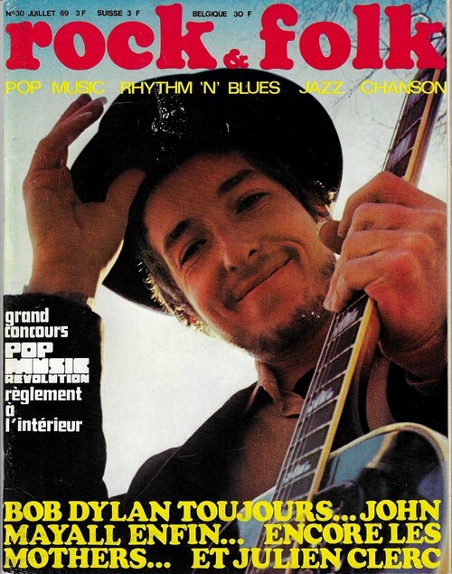 Revue Rock & Folk n° 30 de juillet 1969. In-4 agrafé de 86 pages, au format 27 x 21,5 cm. Couvertures photographiques avec Bob Dylan. Couvertures avec d'infimes frottis aux coins. Intérieur frais. Mensuel musical français consacré à la musique rock et pop, fondé en 1966 par Robert Baudelet, Jean Tronchot, Philippe Adler, Jean-Pierre Leloir et Philippe Koechlin. La revue connut la participation de nombreux photographes dont : Jean-Pierre Leloir, Claude Gassian, Pierre Terrasson, Gaëlle Ghesquière, Bruno Ducourant,Patrice Guino, Jean-Louis Rancurel, Dominique Tarlé, Bertrand Alary et Saddri Derradji. Nombreux articles sur le Rock, le blues, la soul, la pop dont : Bob Dylan, John Mayall, Frank Zappa & les Mothers, Ansley Dumbar, Blind Faith, Elvis Presley, Julien Clerc, etc. Nombreuses chroniques avec de très nombreuses photographies en noir et blanc. Rare édition originale, en très bel état de fraicheur.
