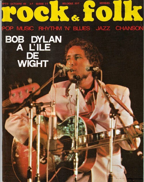 Revue Rock & Folk n° 33 de octobre 1969. In-4 agrafé de 86 pages, au format 27 x 21,5 cm. Couvertures photographiques avec Bob Dylan à l'île de Wight. Couvertures avec d'infimes frottis aux coins. Intérieur frais. Mensuel musical français consacré à la musique rock et pop, fondé en 1966 par Robert Baudelet, Jean Tronchot, Philippe Adler, Jean-Pierre Leloir et Philippe Koechlin. La revue connut la participation de nombreux photographes dont : Jean-Pierre Leloir, Claude Gassian, Pierre Terrasson, Gaëlle Ghesquière, Bruno Ducourant,Patrice Guino, Jean-Louis Rancurel, Dominique Tarlé, Bertrand Alary et Saddri Derradji. Nombreux articles sur le Rock, le blues, la soul, la pop dont : Bob Dylan, Chicago Transit Authority, Wilson Pickett, Blood, Sweat & Tears, etc. Nombreuses chroniques avec de très nombreuses photographies en noir et blanc. Rare édition originale, en très bel état de fraicheur.