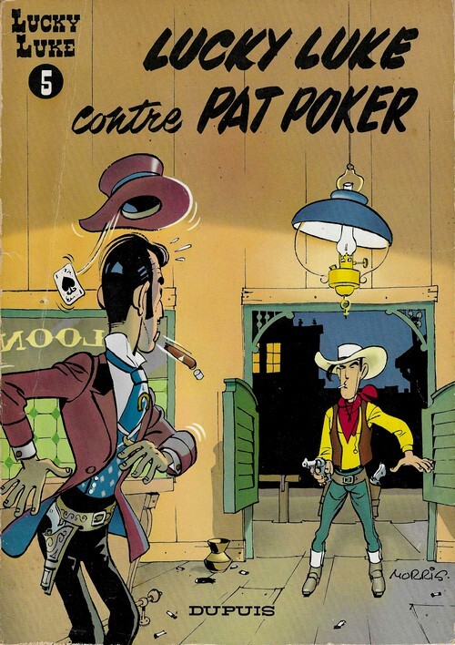 Editions Dupuis / Lucky Luke n° 5 de 1970. In-4 broché de 46 pages au format 29 x 20,5 cm. Couverture illustrée. Dos carré muet avec petits frottis. Plats avec petits frottis aux coins. 4ème plat dit " façon bois " avec 8 couvertures d'albums de Lucky Luke, dont le dernier annoncé est " Tortillas pour les Dalton ". Intérieur frais. Dessins en couleurs et scénario de Morris. Réédition en assez bel état général.