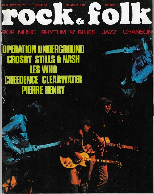 Revue Rock & Folk n° 37 de février 1970. In-4 agrafé de 98 pages, au format 27 x 21,5 cm. Couvertures photographiques avec Opération 666. Couvertures avec d'infimes frottis aux coins. Intérieur frais. Mensuel musical français consacré à la musique rock et pop, fondé en 1966 par Robert Baudelet, Jean Tronchot, Philippe Adler, Jean-Pierre Leloir et Philippe Koechlin. La revue connut la participation de nombreux photographes dont : Jean-Pierre Leloir, Claude Gassian, Pierre Terrasson, Gaëlle Ghesquière, Bruno Ducourant,Patrice Guino, Jean-Louis Rancurel, Dominique Tarlé, Bertrand Alary et Saddri Derradji. Nombreux articles sur le Rock, le blues, la soul, la pop dont : Opération Underground, Crosby, Stills & Nash, Les Who, Creedence Clearwater, Pierre Henry, etc. Nombreuses chroniques avec de très nombreuses photographies en noir et blanc. Rare édition originale, en très bel état de fraicheur.