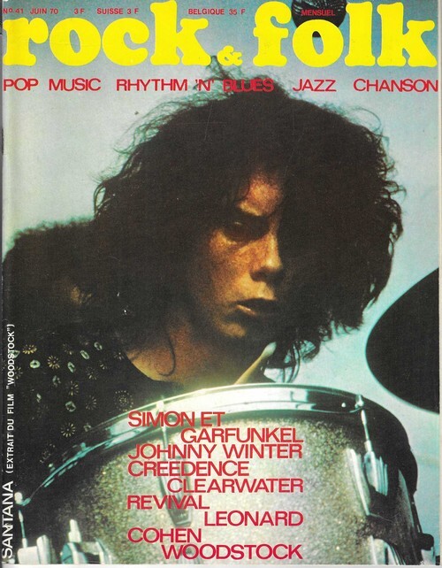 Revue Rock & Folk n° 41 de juin 1970. In-4 agrafé de 102 pages, au format 27 x 21,5 cm. Couvertures photographiques avec Michael Shrieve de Santana. Couvertures avec d'infimes frottis aux coins. Intérieur frais. Mensuel musical français consacré à la musique rock et pop, fondé en 1966 par Robert Baudelet, Jean Tronchot, Philippe Adler, Jean-Pierre Leloir et Philippe Koechlin. La revue connut la participation de nombreux photographes dont : Jean-Pierre Leloir, Claude Gassian, Pierre Terrasson, Gaëlle Ghesquière, Bruno Ducourant,Patrice Guino, Jean-Louis Rancurel, Dominique Tarlé, Bertrand Alary et Saddri Derradji. Nombreux articles sur le Rock, le blues, la soul, la pop dont : Johnny Winter, Simon et Garfunkel, Creedence Clearwater Revival, Leonard Cohen, Les Beatles, Woodstock, etc. Nombreuses chroniques avec de très nombreuses photographies en noir et blanc. Rare édition originale, en très bel état de fraicheur.