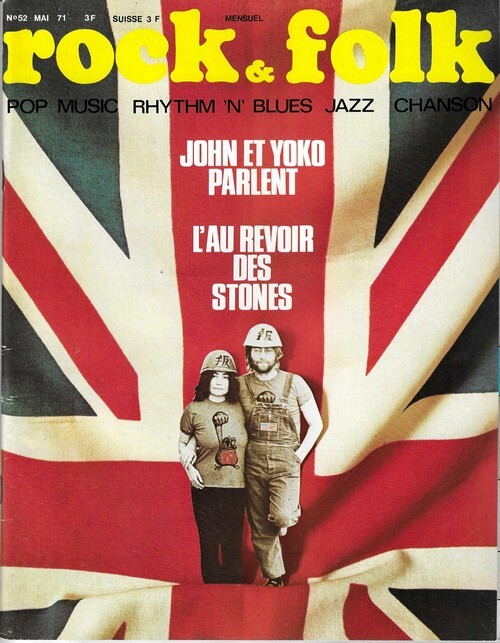 Revue Rock & Folk n° 52 de mai 1971. In-4 agrafé de 106 pages, au format 27 x 21,5 cm. Couvertures photographiques avec John Lennon et Yoko Ono. Couvertures avec d'infimes frottis aux coins. Intérieur frais. Mensuel musical français consacré à la musique rock et pop, fondé en 1966 par Robert Baudelet, Jean Tronchot, Philippe Adler, Jean-Pierre Leloir et Philippe Koechlin. La revue connut la participation de nombreux photographes dont : Jean-Pierre Leloir, Claude Gassian, Pierre Terrasson, Gaëlle Ghesquière, Bruno Ducourant,Patrice Guino, Jean-Louis Rancurel, Dominique Tarlé, Bertrand Alary et Saddri Derradji. Nombreux articles sur le Rock, le blues, la soul, la pop dont : John Lennon et Yoko Ono, Elvis Presley, Pete Brown, The Band, Elton John, etc. Nombreuses chroniques avec de très nombreuses photographies en noir et blanc. Rare édition originale, en très bel état de fraicheur.