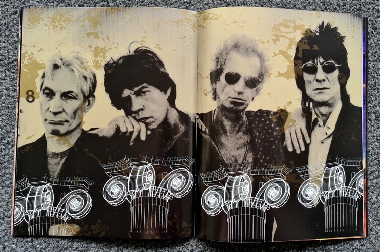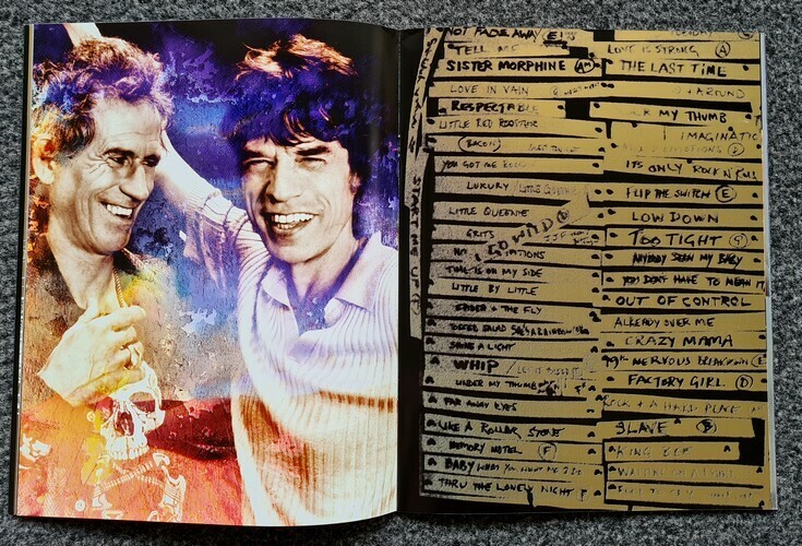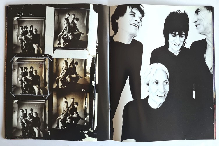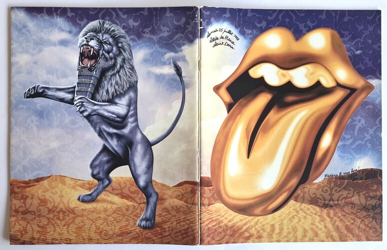 Musidor 1997. In-4 agrafé, non paginé d'environ 40 pages au format 29,5 x 23,5 cm. Couvertures illustrées. Plats et intérieur frais malgré un nom et une annotation manuscrite en couverture. Magnifique et luxueux programme de la tournée mondiale " Bridges to Babylon ", des Rolling Stones qui eut lieu de 1997 à 1998 avec impressions sur calques, double page centrale dépliante et de très nombreuses photographies couleurs de Mick Jagger, Keith Richards, Charlie Watts, Ron Wood, ainsi que des musiciens de la tournée. Un des plus beaux programmes que j'ai eu en ma possession. Rare édition originale américaine en superbe état général. Collection personnelle.