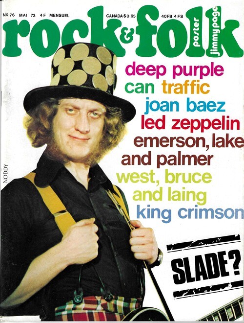 Revue Rock & Folk n° 76 de mai 1973. In-4 agrafé de 124 pages, au format 27 x 21,5 cm. Couvertures photographiques avec Noddy Holder. Couverture en superbe état. Complet du poster dépliant de Jimmy Page au format 40 x 27 cm. Le poster est solidaire de la couverture et plié sous cette dernière. Mensuel musical français consacré à la musique rock et pop, fondé en 1966 par Robert Baudelet, Jean Tronchot, Philippe Adler, Jean-Pierre Leloir et Philippe Koechlin. La revue connut la participation de nombreux photographes dont : Jean-Pierre Leloir, Claude Gassian, Pierre Terrasson, Gaëlle Ghesquière, Bruno Ducourant, Patrice Guino, Jean-Louis Rancurel, Dominique Tarlé, Bertrand Alary et Saddri Derradji. Nombreux articles sur le Rock, le blues, la soul, la pop dont : Noddy Holder, Slade, Deep Purple, Can, Traffic, Joan Baez, Led Zeppelin, Emerson, Lake & Palmer, West, Bruce & Laing, King Crimson, etc. Nombreuses chroniques avec de très nombreuses photographies en noir et blanc. Planche de " Hamster Jovial " par Marcel Gotlib. Edition originale en superbe état général. Rare complet du poster.