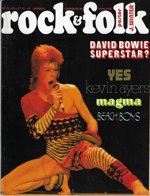 Revue Rock & Folk n° 78 de juillet 1973. In-4 agrafé de 110 pages, au format 27 x 21,5 cm. Couvertures photographiques avec David Bowie. Couverture en superbe état. Complet du poster dépliant de Johnny Winter au format 40 x 27 cm. Le poster est solidaire de la couverture et plié sous cette dernière. Mensuel musical français consacré à la musique rock et pop, fondé en 1966 par Robert Baudelet, Jean Tronchot, Philippe Adler, Jean-Pierre Leloir et Philippe Koechlin. La revue connut la participation de nombreux photographes dont : Jean-Pierre Leloir, Claude Gassian, Pierre Terrasson, Gaëlle Ghesquière, Bruno Ducourant, Patrice Guino, Jean-Louis Rancurel, Dominique Tarlé, Bertrand Alary et Saddri Derradji. Nombreux articles sur le Rock, le blues, la soul, la pop dont : David Bowie, Yes, Kevin Ayers, Magma, Beach Boys, John Mayall, Rolling Stones, Les Comix., etc. Nombreuses chroniques avec de très nombreuses photographies en noir et blanc. Planche de " Hamster Jovial " par Marcel Gotlib. Edition originale en superbe état général. Rare complet du poster.