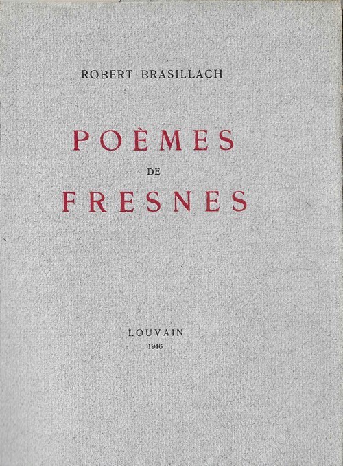 En 1944, Robert Brasillach, arrêté et emprisonné à Fresnes, est condamné à mort pour ses écrits dans Je suis partout. Ne ce faisant aucune illusion sur le résultat des recours déposés par son avocat ou de la demande en grâce signée par les plus grands écrivains français et adressée au général De Gaulle, il attendait son exécution dans sa cellule. Les Poèmes de Fresnes ont été écrits dans cette prison alors que l'auteur n'avait ni stylo ni papier. Il avait réussi à se procurer une plume qu'il cachait dans une pipe et du papier qu il arrachait d'un carnet. C'est par son avocat que ces poèmes sont sortis de Fresnes. Petit manque angulaire au premier plat. Du reste, belle condition.