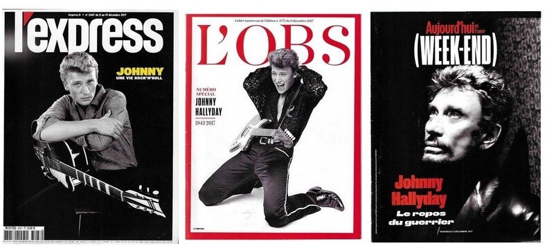 Lot de 5 revues consacrées à Johnny Hallyday suite à son décès en 2017 composé de : L'express, Johnny, une vie de Rock & Roll. ( 2 exemplaires ) + L'Obs, numéro spécial Johnny Hallyday, 1943-2017. ( 2 exemplaires ) + Aujourd'hui en France ( week-end ), Johnny Hallyday, le repos du guerrier. Format 27 x 20 cm. Couvertures photos avec Johnny Hallyday. Nombreuses photographies, articles et chroniques. Editions originales en état de neuf. Bel ensemble.