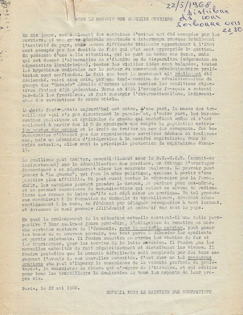 Internationale situationniste 1968. Tract ronéotée au format 27 x 21 cm rédigé par Guy Debord. Trace de trombonne en haut de page. Note d'époque datée du 22/5/1968 d'un étudiant de la sorbonne, écrite au coin supérieur droit du document. Rarissime édition originale de ce tract analysant les évènements depuis le 12 mai 1968 et soulevant diverses hypothèses quant à l'issue du conflit et notemment celle d'une démobilisation des ouvriers organisée par les partis de gauche et les syndicats.