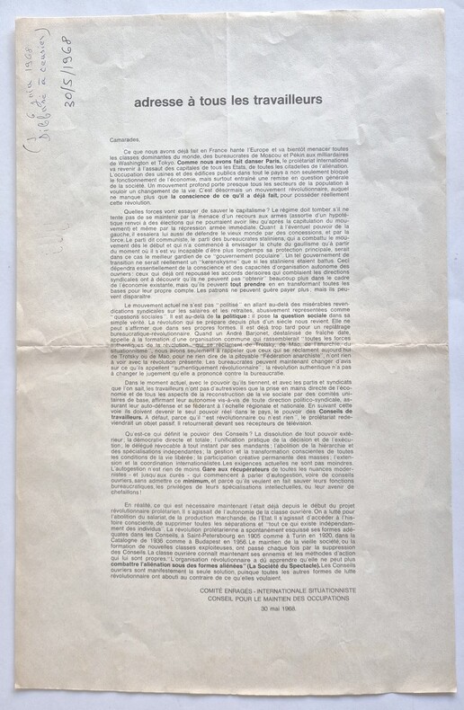 Comité enragés - Internationale situationniste - Conseil pour le maintien des occupations 1968. Tract imprimé au format 44 x 28,5 cm rédigé par Guy Debord. Date ( 30/5/1968 ) et note d'époque d'un étudiant de censier ou de la sorbonne, écrites au coin supérieur gauche du document. Ce dernier a été plié en 4. Rarissime édition originale de ce manifeste sous la forme d'une affichette.