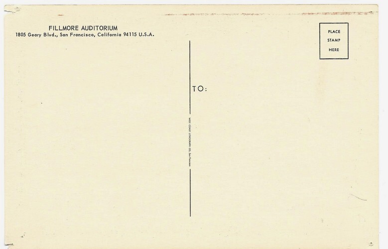 Magnifique carte postale au format 19,5 x 13 cm datant de 1967. Superbe illustration psychédélique, en couleurs, de Wes Wilson, tirée en lithographie. Etat magnifique malgré 2 minuscules traces de punaise aux coins et 2 petites déchirures aux coins inférieurs. Carte éditée pour les concerts présentés par Billy Graham au Fillmore Auditorium de San Francisco les 17et 19 février 1967. Les artistes étaient : The Blues Project, Frank Zappa & The Mothers of Invention, Canned Heat. De toute rareté.