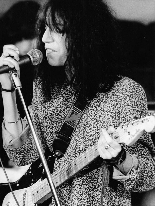 Superbe photographie originale, argentique, en noir et blanc de Patti Smith, sur scène, lors d'un concert, prise fin des années 70. Format 24 x 18 cm. Cachet au verso.