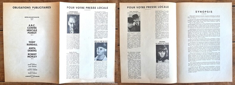 MGM 1965. Plaquette dépliante de 8 pages au format 29,5 x 21 cm. Couvertures illustrées. Premier plat avec petites taches. Deux renforcements au scotch au verso. Intérieur frais avec synopsis, photographies en noir extraites du film, illustrations et 3 pavés de presse, illustrés, de 4 pages. ABC contre Hercule Poirot ( The Alphabet Murders) est une comédie policière britannique, réalisée par Frank Tashlin, sortie en 1965. Scénario d'après le roman " The A.B.C. Murders " d'Agatha Christie publié en 1936. On trouve dans les rôles principaux : Tony Randall, Anita Ekberg, Robert Morley et Maurice Denham. Rare édition originale en bel état général.
