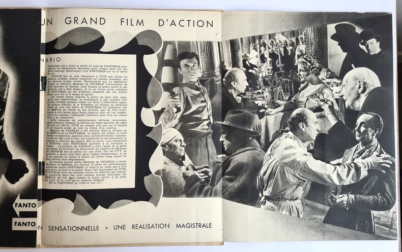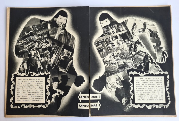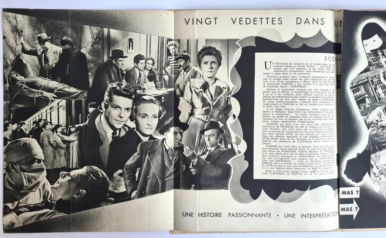 Pathé Consortium Cinéma 1949. Plaquette dépliante de 8 pages au format 31 x 23,5 cm. Couvertures illustrées. Premier plat avec petits frottis aux coins. Intérieur frais avec scénario du film, accompagnés de superbes en photographies, dépliantes, en noir extraites du film, tirées en héliogravure. Fantômas contre Fantômas est un film français réalisé par Robert Vernay, sorti en 1949. Scénario d'après l'oeuvre de Marcel Allain. On trouve dans les rôles principaux : Aimé Clariond, Maurice Teynac, Marcelle Chantal, Yves Furet et Alexandre Rignault. Très rare édition originale en bel état général.