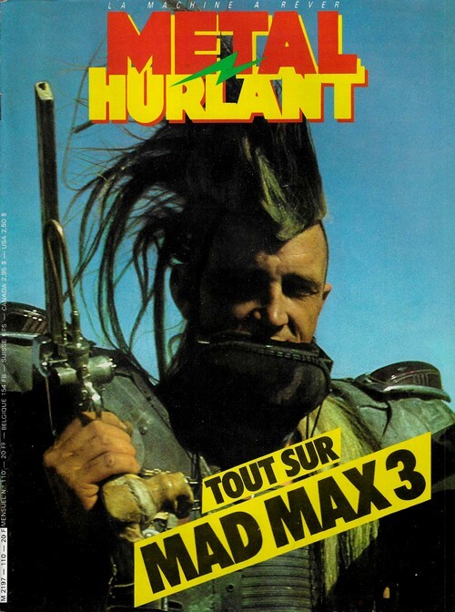 Revue Métal Hurlant n° 110 de 1985. In-4 agrafé de 108 pages au format 28,5 x 21,5. Couverture illustrée d'une photographie du film Mad Max 3. Plats et intérieur frais. BD et dessins de Liberatore, Charles Burns, Tramber, Max, Charlie Schlingo, Gauckler, Joël Houssin, Frank Margerin, Moebius, Alejandro Jodorowsky, etc. Indispensable numéro qui contient 14 pages illustrées de photographies, consacrées au film de George Miller " Au-delà du dôme du tonnerre (Mad Max Beyond Thunderdome) ", avec Mel Gibson et Tina Turner. Article sur Terminator de James Cameron avec Arnold Schwartzenegger et sur James Crumley. Exemplaire en très bel état de fraicheur. Edition originale.
