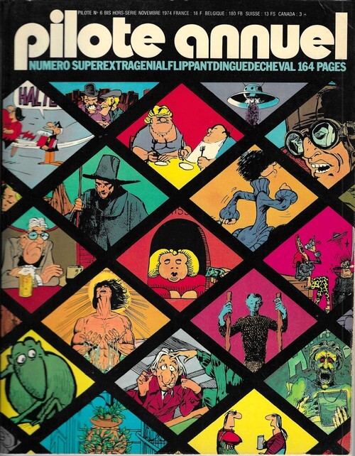 Editions Dargaud / Pilote n° 6 bis, hors série : Pilote Annuel, Cru 1975. In-4 broché de 164 pages au format 27,5 x 21,5 cm. Couverture illustrée. Dos carré. Plats et intérieur frais, malgré d'infimes frottis aux coins. Contient des BD en récits complets en couleurs et en noir par Alexis, Don Martin, Enki Bilal, Marcel Gotlib, Loro, F'Murr, Jacques Tardi, Claire Btétecher, Lob, Jean Solé, René Pétillon, René Goscinny, Got, Fred, Loro, etc. Edition originale en bel état de fraicheur.