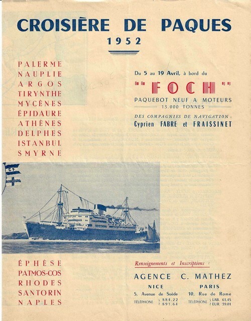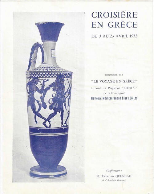 Société Neptos 1952. Lot de deux plaquettes publicitaires de 4 pages chacune, au format 27 x 21 cm, annonçant deux croisières en Grèce en 1952. Texte inédit de Raymond Queneau, conférencier sur l'une d'entre-elles. Rare. Superbe état général