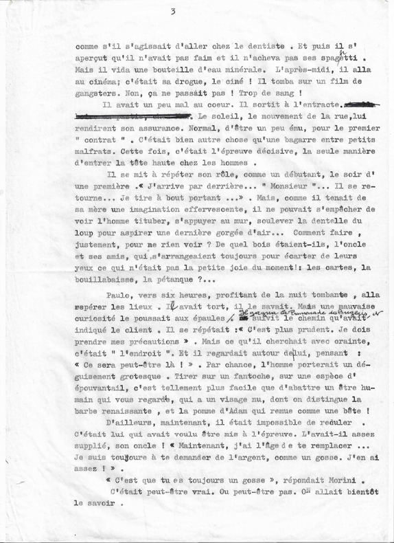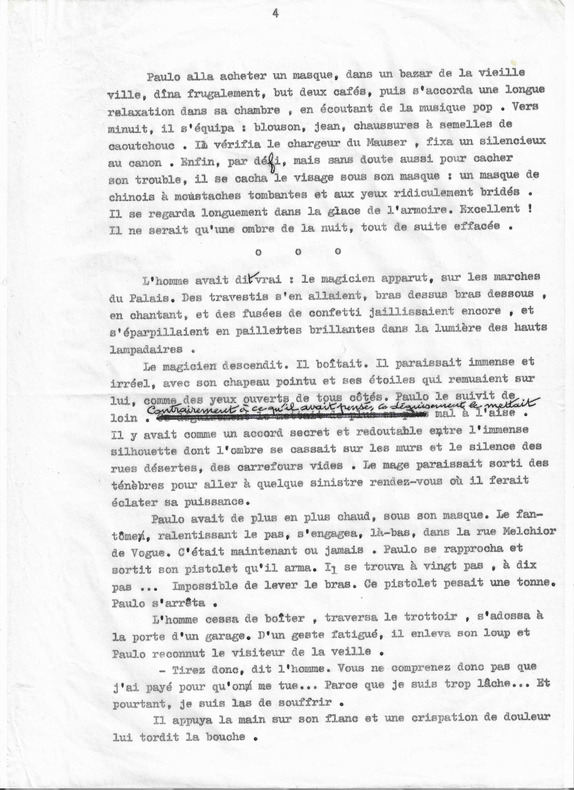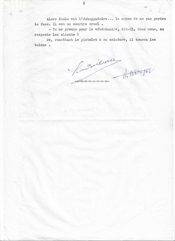 Rarissime tapuscrit original de 5 pages numérotés sur papier pelure, avec corrections manuscrites et signatures de Pierre Boileau et Thomas Narcejac. Ce texte sera édité aux éditions Matarasso en 1987 en tirage limité à 66 exemplaires numérotés sur Arches, avec illustrations d'Anne Proszynska-Hurel.